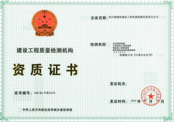 近日,經四川省住房和城鄉建設廳核準,重慶設計集團市建科院所屬子企業四川渝建研建設工程質量檢測有限責任公司(以下簡稱“渝建研”)申請重新核定的建設工程質量檢測機構資質于2023年3月成功獲批并順利取證。