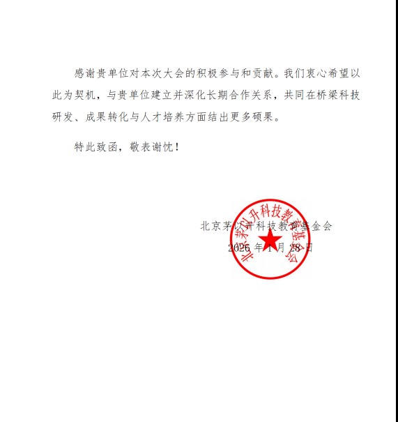 基金會在感謝信中表示,市建科院的監理工作和專業展示,為本次論壇的成功舉辦提供了重要支撐,體現了新時代監理單位在重大工程建設中的技術擔當與行業價值。這份認可,既是對市建科院團隊專業能力的認可,也是對重慶設計集團在橋梁工程領域持續貢獻的肯定。