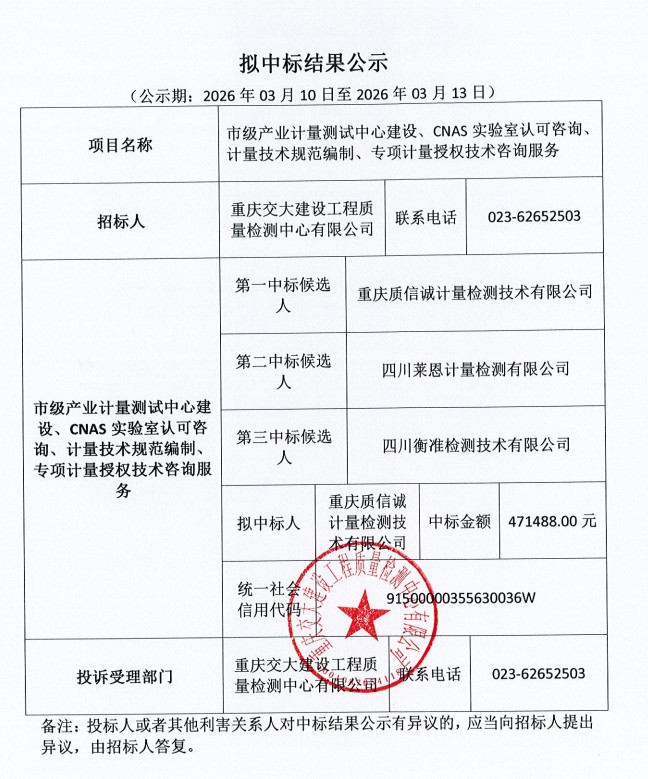 市級產業計量測試中心建設、CNAS實驗室認可咨詢、計量技術規范編制、專項計量授權技術咨詢服務中標公告